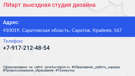 ЛИарт, выездная студия дизайна по адресу 410019, Саратовская область, Саратов, Крайняя, 167 в дальнейшем Организация, размещена в следующих категориях: