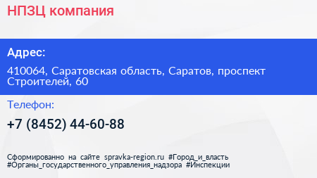 НПЗЦ, компания по адресу 410064, Саратовская область, Саратов, проспект Строителей, 60 в дальнейшем Организация, размещена в следующих категориях: