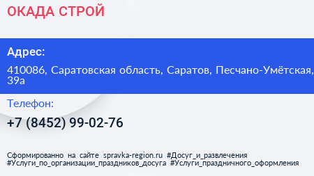 ОКАДА СТРОЙ по адресу 410086, Саратовская область, Саратов, Песчано-Умётская, 39а в дальнейшем Организация, размещена в следующих категориях: