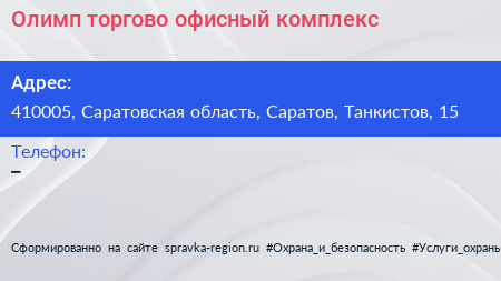 Олимп, торгово-офисный комплекс по адресу 410005, Саратовская область, Саратов, Танкистов, 15 в дальнейшем Организация, размещена в следующих категориях: