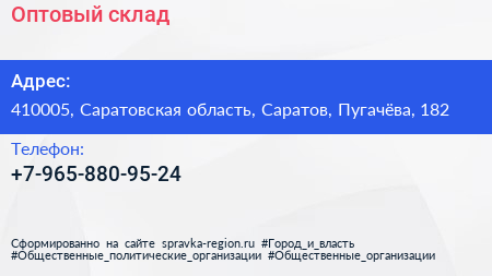 Оптовый склад по адресу 410005, Саратовская область, Саратов, Пугачёва, 182 в дальнейшем Организация, размещена в следующих категориях: