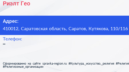 Риэлт-Гео по адресу 410012, Саратовская область, Саратов, Кутякова, 110/116 в дальнейшем Организация, размещена в следующих категориях: