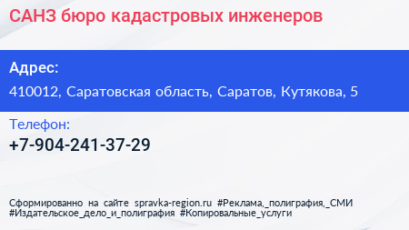 САНЗ, бюро кадастровых инженеров по адресу 410012, Саратовская область, Саратов, Кутякова, 5 в дальнейшем Организация, размещена в следующих категориях: