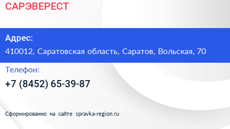 САРЭВЕРЕСТ по адресу 410012, Саратовская область, Саратов, Вольская, 70 в дальнейшем Организация, размещена в следующих категориях: