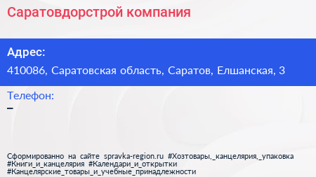 Саратовдорстрой, компания по адресу 410086, Саратовская область, Саратов, Елшанская, 3 в дальнейшем Организация, размещена в следующих категориях: