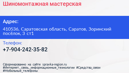 Шиномонтажная мастерская по адресу 410536, Саратовская область, Саратов, Зоринский посёлок, 3 ст1 в дальнейшем Организация, размещена в следующих категориях: