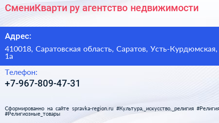 СмениКварти.ру, агентство недвижимости по адресу 410018, Саратовская область, Саратов, Усть-Курдюмская, 1а в дальнейшем Организация, размещена в следующих категориях: