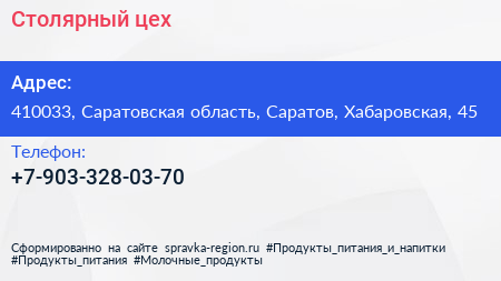 Столярный цех по адресу 410033, Саратовская область, Саратов, Хабаровская, 45 в дальнейшем Организация, размещена в следующих категориях:
