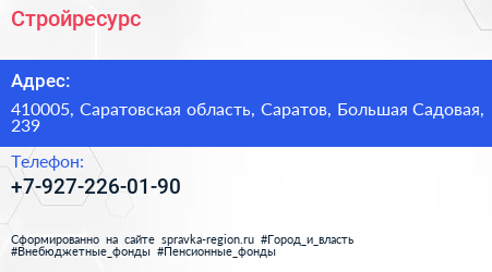 Стройресурс по адресу 410005, Саратовская область, Саратов, Большая Садовая, 239 в дальнейшем Организация, размещена в следующих категориях: