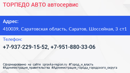 ТОРПЕДО-АВТО, автосервис по адресу 410039, Саратовская область, Саратов, Шоссейная, 3 ст1 в дальнейшем Организация, размещена в следующих категориях: