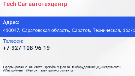Tech Car, автотехцентр по адресу 410047, Саратовская область, Саратов, Техническая, 16а/1 в дальнейшем Организация, размещена в следующих категориях:
