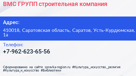 ВМС ГРУПП, строительная компания по адресу 410018, Саратовская область, Саратов, Усть-Курдюмская, 1а в дальнейшем Организация, размещена в следующих категориях: