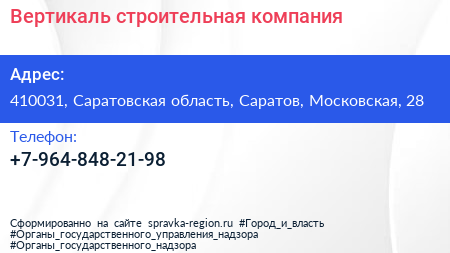 Вертикаль, строительная компания по адресу 410031, Саратовская область, Саратов, Московская, 28 в дальнейшем Организация, размещена в следующих категориях: