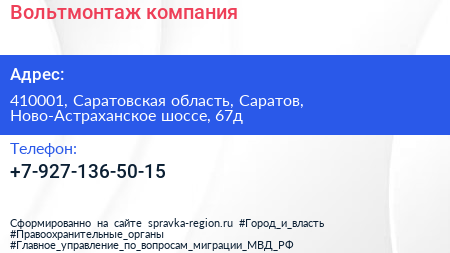 Вольтмонтаж, компания по адресу 410001, Саратовская область, Саратов, Ново-Астраханское шоссе, 67д в дальнейшем Организация, размещена в следующих категориях: