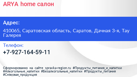 ARYA home, салон по адресу 410065, Саратовская область, Саратов, Дачная 3-я, Тау Галерея в дальнейшем Организация, размещена в следующих категориях: