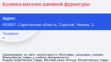 Бусинка, магазин швейной фурнитуры по адресу 410007, Саратовская область, Саратов, Чехова, 2 в дальнейшем Организация, размещена в следующих категориях: