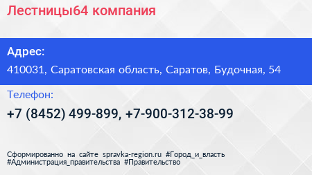 Лестницы64, компания по адресу 410031, Саратовская область, Саратов, Будочная, 54 в дальнейшем Организация, размещена в следующих категориях: