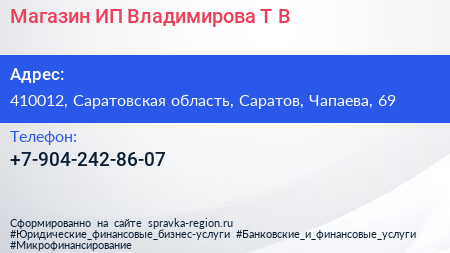 Магазин, ИП Владимирова Т.В. по адресу 410012, Саратовская область, Саратов, Чапаева, 69 в дальнейшем Организация, размещена в следующих категориях: