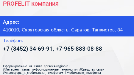 PROFELIT, компания по адресу 410010, Саратовская область, Саратов, Танкистов, 84 в дальнейшем Организация, размещена в следующих категориях: