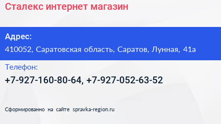 Сталекс, интернет-магазин по адресу 410052, Саратовская область, Саратов, Лунная, 41а в дальнейшем Организация, размещена в следующих категориях: