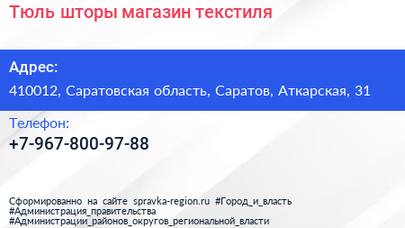 Тюль & шторы, магазин текстиля по адресу 410012, Саратовская область, Саратов, Аткарская, 31 в дальнейшем Организация, размещена в следующих категориях: