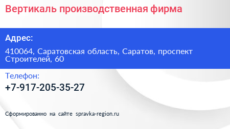Вертикаль, производственная фирма по адресу 410064, Саратовская область, Саратов, проспект Строителей, 60 в дальнейшем Организация, размещена в следующих категориях: