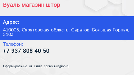 Вуаль, магазин штор по адресу 410005, Саратовская область, Саратов, Большая Горная, 310а в дальнейшем Организация, размещена в следующих категориях: