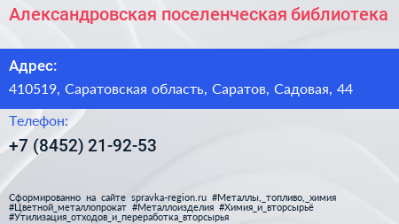 Александровская поселенческая библиотека по адресу 410519, Саратовская область, Саратов, Садовая, 44 в дальнейшем Организация, размещена в следующих категориях: