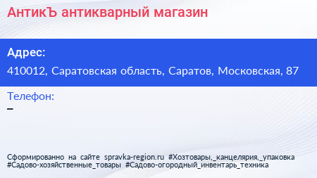 АнтикЪ, антикварный магазин по адресу 410012, Саратовская область, Саратов, Московская, 87 в дальнейшем Организация, размещена в следующих категориях: