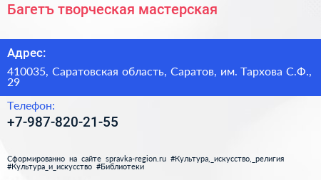 Багетъ, творческая мастерская по адресу 410035, Саратовская область, Саратов, им. Тархова С.Ф., 29 в дальнейшем Организация, размещена в следующих категориях: