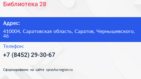 Библиотека №28 по адресу 410004, Саратовская область, Саратов, Чернышевского, 46 в дальнейшем Организация, размещена в следующих категориях: