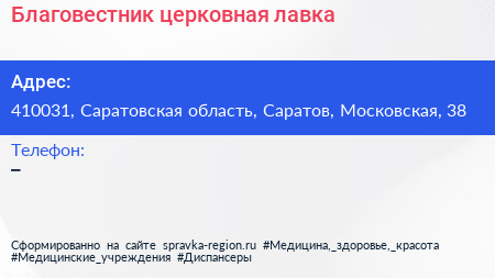Благовестник, церковная лавка по адресу 410031, Саратовская область, Саратов, Московская, 38 в дальнейшем Организация, размещена в следующих категориях: