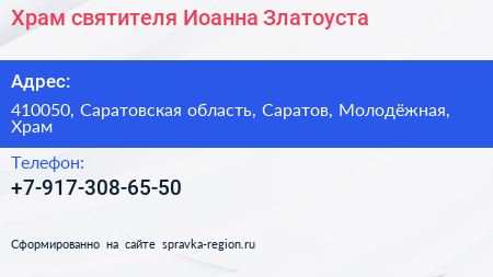Храм святителя Иоанна Златоуста по адресу 410050, Саратовская область, Саратов, Молодёжная, Храм в дальнейшем Организация, размещена в следующих категориях: