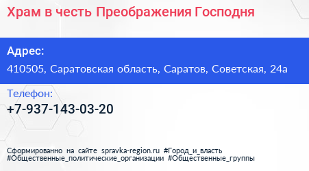 Храм в честь Преображения Господня по адресу 410505, Саратовская область, Саратов, Советская, 24а в дальнейшем Организация, размещена в следующих категориях: