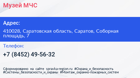 Музей МЧС по адресу 410028, Саратовская область, Саратов, Соборная площадь, 7 в дальнейшем Организация, размещена в следующих категориях: