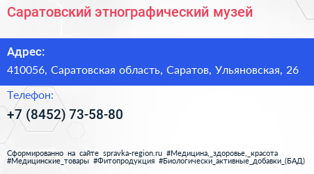 Саратовский этнографический музей по адресу 410056, Саратовская область, Саратов, Ульяновская, 26 в дальнейшем Организация, размещена в следующих категориях: