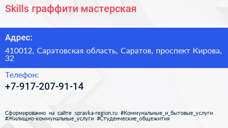 Skills, граффити-мастерская по адресу 410012, Саратовская область, Саратов, проспект Кирова, 32 в дальнейшем Организация, размещена в следующих категориях: