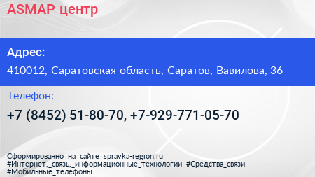 ASMAP, центр по адресу 410012, Саратовская область, Саратов, Вавилова, 36 в дальнейшем Организация, размещена в следующих категориях: