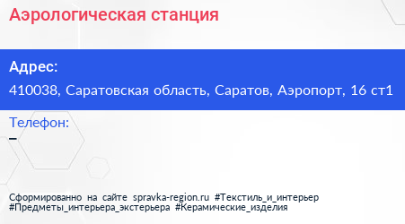 Аэрологическая станция по адресу 410038, Саратовская область, Саратов, Аэропорт, 16 ст1 в дальнейшем Организация, размещена в следующих категориях:
