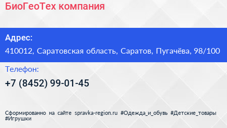 БиоГеоТех, компания по адресу 410012, Саратовская область, Саратов, Пугачёва, 98/100 в дальнейшем Организация, размещена в следующих категориях: