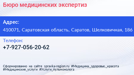 Бюро медицинских экспертиз по адресу 410071, Саратовская область, Саратов, Шелковичная, 186 в дальнейшем Организация, размещена в следующих категориях: