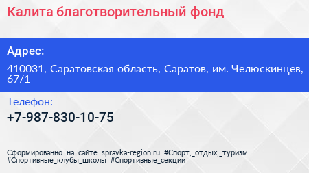 Калита, благотворительный фонд по адресу 410031, Саратовская область, Саратов, им. Челюскинцев, 67/1 в дальнейшем Организация, размещена в следующих категориях: