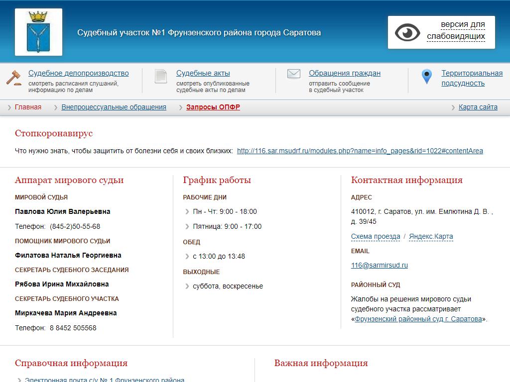 Мировые судьи Фрунзенского района по адресу 410012, Саратовская область, Саратов, им. Емлютина Д.В., 39/45 в дальнейшем Организация, размещена в следующих категориях: