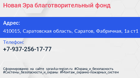 Новая Эра, благотворительный фонд по адресу 410015, Саратовская область, Саратов, Фабричная, 1а ст1 в дальнейшем Организация, размещена в следующих категориях: