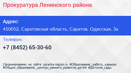 Прокуратура Ленинского района по адресу 410052, Саратовская область, Саратов, Одесская, 3а в дальнейшем Организация, размещена в следующих категориях: