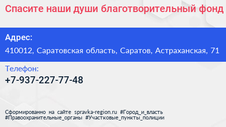 Спасите наши души, благотворительный фонд по адресу 410012, Саратовская область, Саратов, Астраханская, 71 в дальнейшем Организация, размещена в следующих категориях: