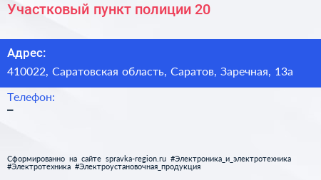 Участковый пункт полиции №20 по адресу 410022, Саратовская область, Саратов, Заречная, 13а в дальнейшем Организация, размещена в следующих категориях: