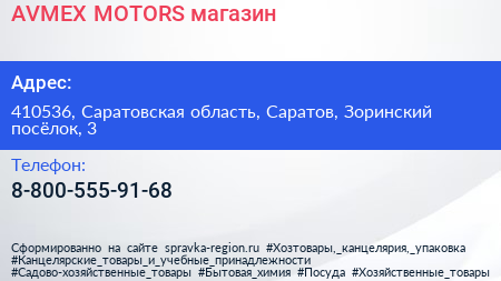 AVMEX-MOTORS, магазин по адресу 410536, Саратовская область, Саратов, Зоринский посёлок, 3 в дальнейшем Организация, размещена в следующих категориях: