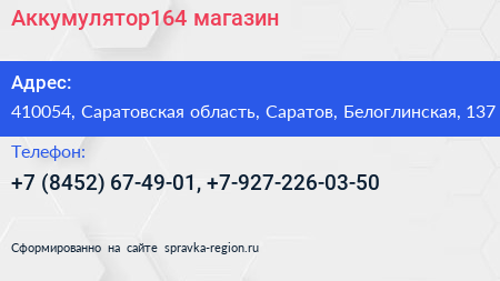 Аккумулятор164, магазин по адресу 410054, Саратовская область, Саратов, Белоглинская, 137 в дальнейшем Организация, размещена в следующих категориях: