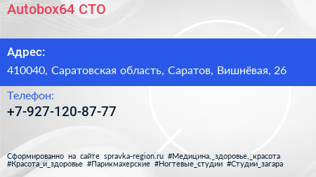 Autobox64, СТО по адресу 410040, Саратовская область, Саратов, Вишнёвая, 26 в дальнейшем Организация, размещена в следующих категориях: